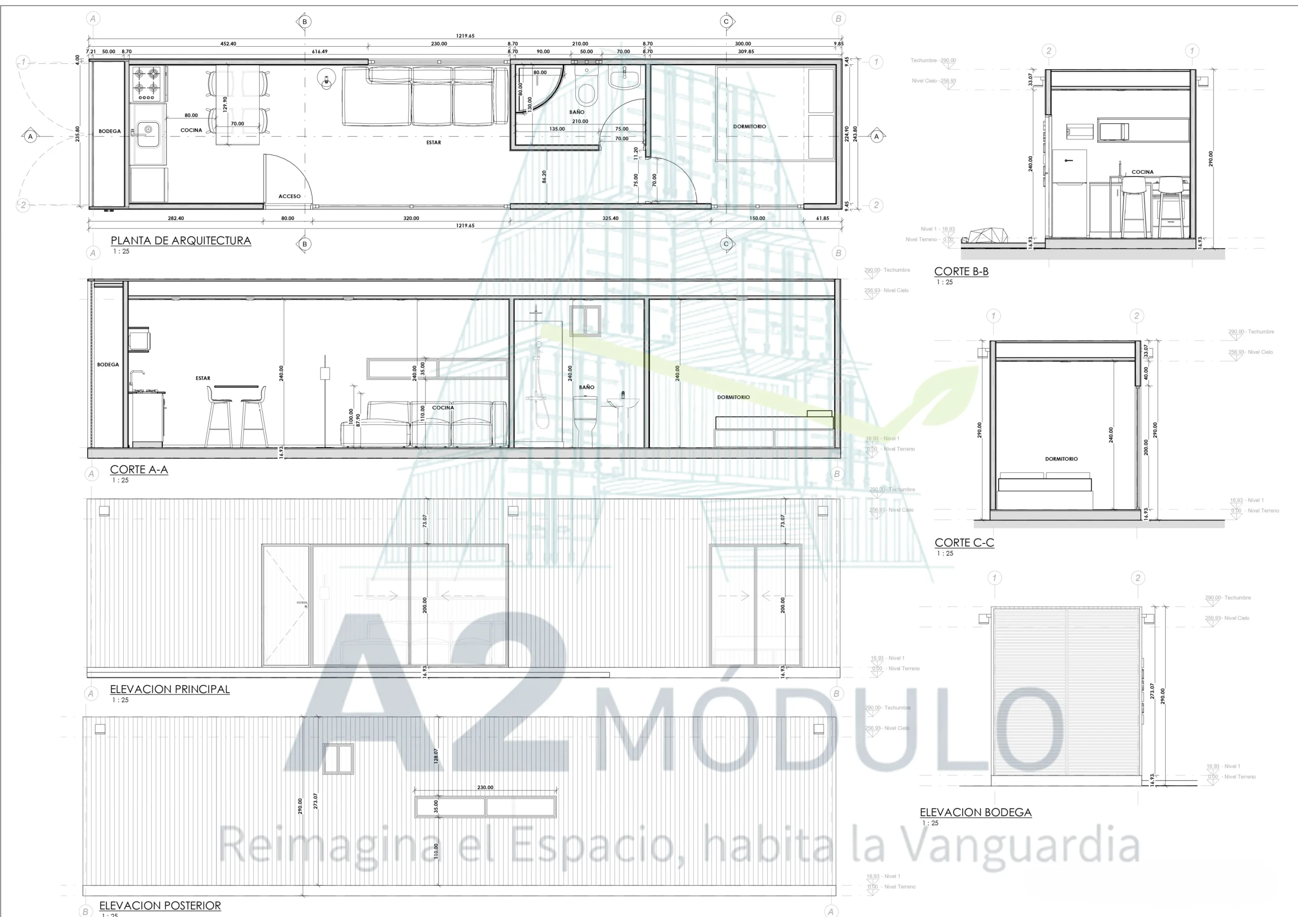 A2 Módulo: Casas modulares, oficinas y bodegas en contenedores en Chile, con diseño, topografía y regularización integral.